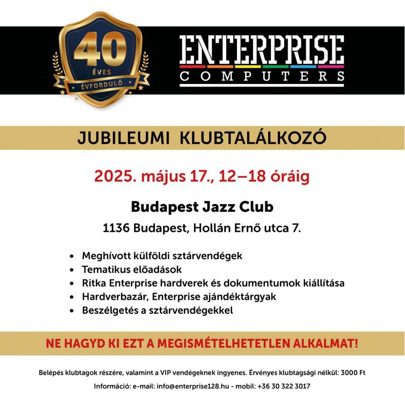 Az Enterprise számítógép 40. születésnapját ünnepli. Az Enterprise Klub szervezésében a jubileumi klubtalálkozó május 17-én 12:00-kor kezdődik a Budapest Jazz Clubban (Hollán Ernő utca 7.).
