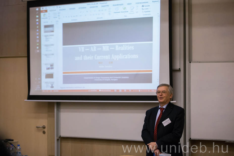 Mihálydeák Tamás, az Informatikai Kar dékánja, Sztrik János, az Informatikai Tudományok Doktori Iskola vezetője és Fazekas Attila, az Informatikai Kar oktatási dékánhelyettese, a Neumann János Számítógép-tudományi Társaság Hajdú-Bihar Megyei Területi Szervezetének elnöke hivatalos megnyitója után az első tudományos előadást Tanács Attila tartotta, Virtual-, Augmented- és Mixed Reality témában.