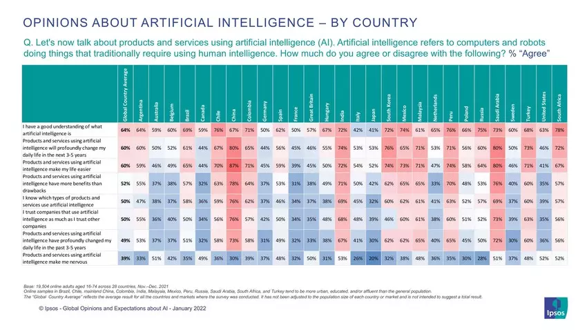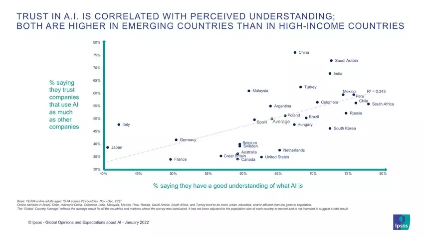 - A feltörekvő országok pozitívabban álltak hozzá a mesterséges intelligenciához, mint a piacvezető gazdaságok. Az Ipsos jelentése szerint a feltörekvő országok polgárai a piacvezető országok polgáraihoz képest jelentősen nagyobb mértékben számolnak be arról, hogy ismerik a mesterséges intelligenciát, bíznak a mesterséges intelligenciát alkalmazó vállalatokban, és pozitívan ítélik meg a mesterséges intelligenciával működő termékek és szolgáltatások hatását az életükre. (Vö. Magyarország vs. Japán vagy Németország.)