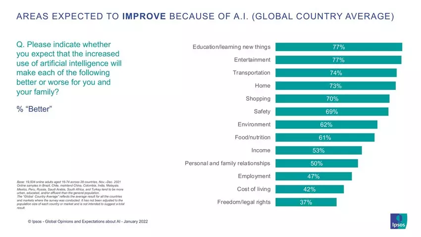 - Az emberek elvárják, hogy a mesterséges intelligencia jobbá tegye számukra és családjuk számára az oktatást. Vannak pár terület, ahol a válaszadók szerint a mesterséges intelligencia javítani fogja az életüket. A lista élén ismét az oktatás áll, az első három helyen pedig a szórakoztatás és a közlekedés szerepel.